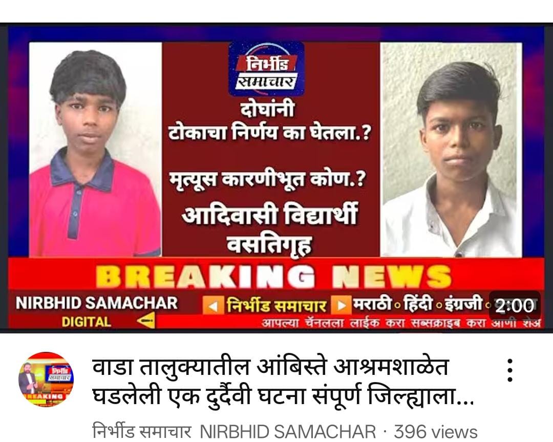 वाडा: तालुक्यातील आंबिस्ते येथील कै . दिगंबर पाडवी प्राथमिक व माध्यमिक आश्रमशाळेतील दोन विद्यार्थिनी बुधवारी मध्यरात्री झाडाला जोडी बांधून गळफास घेऊन देविदास परशुराम नवले ( 15 ) व मनोज सिताराम वड ( 14 ) विद्यार्थ्यांची नावे आहेत दोघे अनुक्रमे दहावी नववीत शिकत असून मोखाडा तालुक्यातील बिवळपाडा व दापटी येथील रहिवासी आहेत याप्रकरणी मुख्याध्यापक दाते , अधीक्षक राजू सावकरे यांना निर्बंधित केल्याची माहिती संस्थेचे विश्वस्त भरत यांनी दिले . अबिस्ते येथे कै . दिगंबर पाडवी प्राथमिक व माध्यमिक आश्रम शाळा आहे . येथे पहिली ते दहावीपर्यंत वर्ग असून सुमारे 450 विद्यार्थिनी येथे निवासी शिक्षण घेत आहेत बुधवार दिनांक रात्रीचे जेवण झाल्यावर सर्व विद्यार्थिनी झोपले . नेहमीप्रमाणे मध्यरात्रीच्या सुमारास सुरक्षारक्षक शाळेच्या मार्गाच्या बाजूला गस्त घालत असताना त्यांना झाडाला काहीतरी लटकतं असल्याचे दिसले. ते झाडाच्या जवळ गेले असता दोन विद्यार्थिनी गळफास घेतल्याचे स्पष्ट झाले. सुरक्षकांनी तत्काळ मुख्याध्यापक अध्यक्ष व इतर शिक्षकांना आत्महत्या ची माहिती काही वेळात पोलिसात तेथे दाखल झाले.