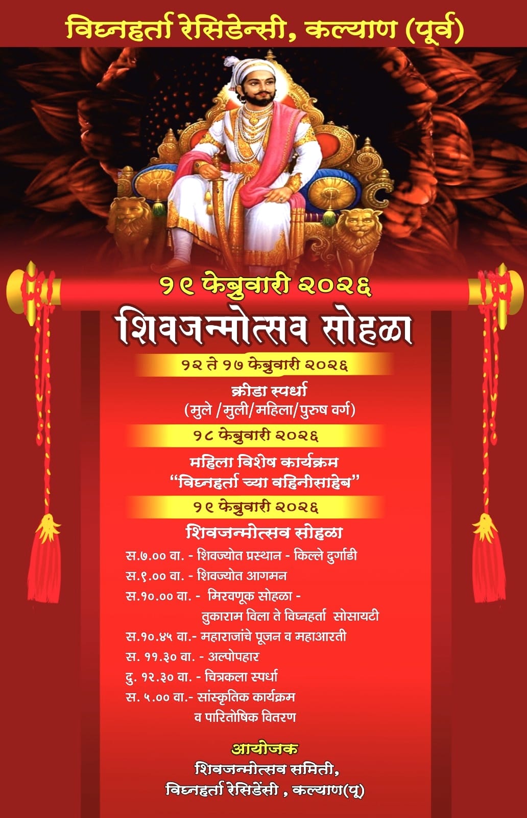 या शिवजन्मोत्सव सोहळ्याचे आयोजन शिवजन्मोत्सव समिती, विघ्नहर्ता रेसिडेन्सी, कल्याण (पूर्व) यांच्या वतीने करण्यात आले असून नागरिकांनी मोठ्या संख्येने उपस्थित राहण्याचे आवाहन आयोजकांनी केले आहे.
