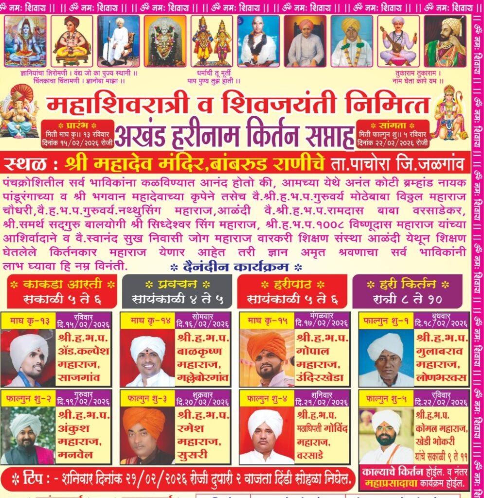 बांबरुड राणीचे येथे महाशिवरात्री व शिवजयंती निमित्त अखंड हरिनाम कीर्तन सप्ताह आयोजित केला आहे महादेव मंदिर येथे दरवर्षी प्रमाणे महाशिवरात्री ला किर्तन व सप्ताह आयोजित केले जाते. श्री भगवान महादेवाच्या कृपेने बांबरुड गावात दरवर्षी कीर्तन व सप्ताह सात दिवस आयोजित केला जातो त्यात सकाळी काकड आरती 5ते 6, प्रवचन, सायंकाळी4 ते 5, हरिपाठ5 ते 6 हरी किर्तन रात्री8 ते 10 वाजेपर्यंत कीर्तन राहील कीर्तनाचा गावातील ग्रामस्थ मोठ्या प्रमाणात लाभ घेतात दर दिवशी कीर्तनाचा कार्यक्रम आयोजित केला