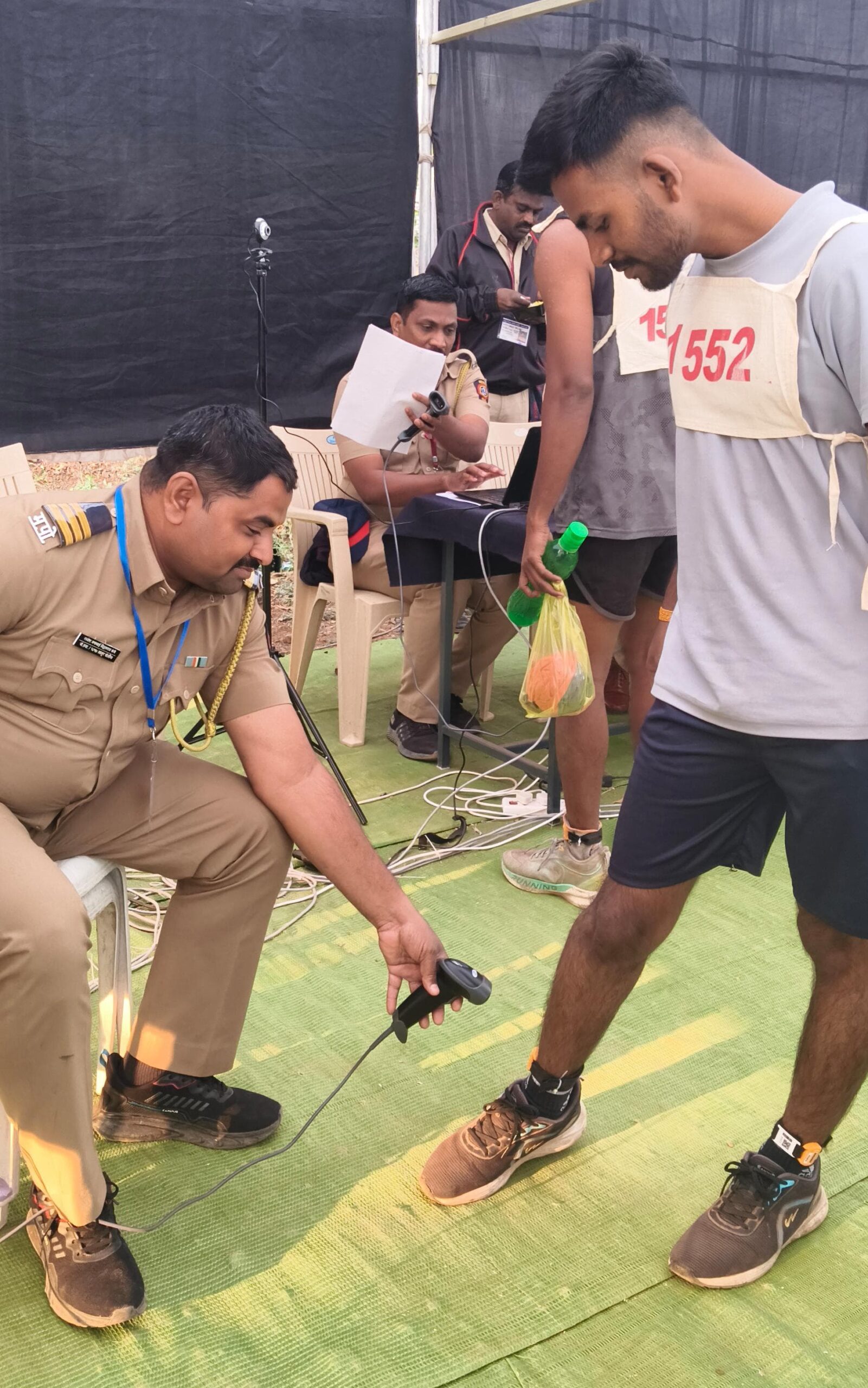 🔹RFID (Radio Frequency Identification) चिप प्रणाली. धावण्याच्या चाचणीत शंभर टक्के अचूकता आणण्यासाठी मैदानी धाव चाचणीदरम्यान प्रत्येक उमेदवाराच्या पायाला RFID चिप स्ट्रॅपद्वारे सुरक्षितपणे बांधली जाते. सदर RFID चिप मुळे अचूक वेळ नोंद. धाव चाचणी सुरू होताच सेन्सर प्रणालीद्वारे उमेदवाराने पूर्ण केलेल्या अंतराची सेकंदागणिक डिजिटल नोंद होते. मानवी हस्तक्षेप टाळल्यामुळे वेळ मोजण्यात कोणतीही चूक राहत नाही. फेऱ्यांची स्वयंचलित मोजणी. लांब पल्ल्याच्या धावण्यात प्रत्येक फेरीची नोंद स्वयंचलितपणे केली जाते.✔ फसवणूक प्रतिबंध. प्रत्येक RFID चिप उमेदवाराच्या विशिष्ट नोंदणी क्रमांकाशी जोडलेली असल्याने गैर प्रकारांना पूर्णतः आळा बसतो.