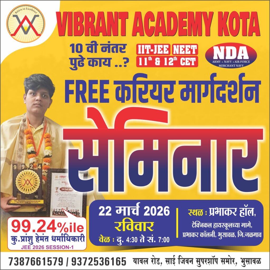 рднреБрд╕рд╛рд╡рд│ (рдкреНрд░рддрд┐рдирд┐рдзреА): рджреЗрд╢рд╛рддреАрд▓ рдЕрддреНрдпрдВрдд рдХрдареАрдг рдорд╛рдирд▓реНрдпрд╛ рдЬрд╛рдгрд╛рд▒реНрдпрд╛ JEE (Main) реирежреирем рдкрд░реАрдХреНрд╖реЗрдд рдЬрд│рдЧрд╛рд╡ рдЬрд┐рд▓реНрд╣реНрдпрд╛рдЪреНрдпрд╛ рдпрд╢рд╛рдд рдорд╛рдирд╛рдЪрд╛ рддреБрд░рд╛ рд░реЛрд╡рд▓рд╛ рдЧреЗрд▓рд╛ рдЖрд╣реЗ. рднреБрд╕рд╛рд╡рд│ рдпреЗрдереАрд▓ рд╡реНрд╣рд╛рдпрдмреНрд░рдВрдЯ рдЕрдХреЕрдбрдореА (Vibrant Academy) рдЪрд╛ рд╡рд┐рджреНрдпрд╛рд░реНрдереА рдХреБ. рдкреНрд░рд╛рдВрд╢реБ рд╣реЗрдордВрдд рдзрд░реНрдорд╛рдзрд┐рдХрд╛рд░реА рдпрд╛рдиреЗ репреп.реирек рдкрд░реНрд╕реЗрдВрдЯрд╛рдИрд▓ рдЧреБрдг рдорд┐рд│рд╡реВрди рдХреЗрд╡рд│ рднреБрд╕рд╛рд╡рд│рдЪ рдирд╡реНрд╣реЗ, рддрд░ рд╕рдВрдкреВрд░реНрдг рдЬрд│рдЧрд╛рд╡ рдЬрд┐рд▓реНрд╣реНрдпрд╛рдд рдкреНрд░рдердо рдХреНрд░рдорд╛рдВрдХ рдкрдЯрдХрд╛рд╡рд▓рд╛ рдЖрд╣реЗ.