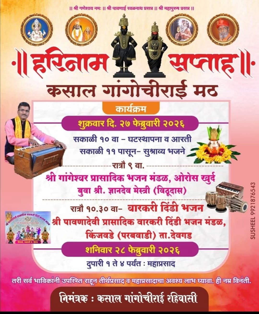 рд╕рд┐рдВрдзреБрджреБрд░реНрдЧ рдкреНрд░рддрд┐рдирд┐рдзреА :- рдХрд╕рд╛рд▓ рдЧрд╛рдВрдЧреЛрдЪреАрд░рд╛рдИ рдорда рдпреЗрдереЗ рд╢реБрдХреНрд░рд╡рд╛рд░ реирен рдлреЗрдмреНрд░реБрд╡рд╛рд░реА реирежреирем рд░реЛрдЬреА рд╕рдХрд╛рд│реА рд╣рд░рд┐рдирд╛рдо рд╕рдкреНрддрд╛рд╣рд╛рдЪреЗ рдЖрдпреЛрдЬрди рдХрд░рдгреНрдпрд╛рдд рдЖрд▓реЗ рдЖрд╣реЗ. рд╢реБрдХреНрд░рд╡рд╛рд░реА рд╕рдХрд╛рд│реА резреж рд╡рд╛рдЬрддрд╛ рдШрдЯрд╕реНрдерд╛рдкрдирд╛, рдЖрд░рддреА, рд╕рдХрд╛рд│реА резрез.режреж рд╡рд╛рдЬрд▓реНрдпрд╛ рдкрд╛рд╕реВрди рднрдЬрдиреЗ, рд░рд╛рддреНрд░реА реп рд╡рд╛. рдЧрд╛рдВрдЧреЗрд╢реНрд╡рд░ рднрдЬрди рдордВрдбрд│-рдмреБрд╡рд╛ рдЬреНрдЮрд╛рдирджреЗрд╡ рдореЗрд╕реНрддреНрд░реА рдпрд╛рдВрдЪреЗ рднрдЬрди, резреж.рейреж рд╡рд╛. рджреЗрд╡рдЧрдб рдпреЗрдереАрд▓ рдкрд╛рд╡рдгрд╛рдИ рд╡рд╛рд░рдХрд░реА рднрдЬрди рдордВрдбрд│, рдХрд┐рдВрдЬрд╡рдбреЗ-рдкрд░рдмрд╡рд╛рдбреА рдпрд╛рдВрдЪреЗ рд╡рд╛рд░рдХрд░реА рджрд┐рдВрдбреА рднрдЬрди. рд╢рдирд┐рд╡рд╛рд░, реирео рд░реЛрдЬреА рджреБрдкрд╛рд░реА рез рддреЗ рек рдпрд╛ рд╡реЗрд│реЗрдд рдорд╣рд╛рдкреНрд░рд╕рд╛рдж рд╣реЛрдгрд╛рд░ рдЖрд╣реЗ. рдпрд╛ рд╕рд░реНрд╡ рдХрд╛рд░реНрдпрдХреНрд░рдорд╛рдВрдирд╛ рдЙрдкрд╕реНрдерд┐рдд рд░рд╛рд╣рд╡реЗ, рдЕрд╕реЗ рдЖрд╡рд╛рд╣рди рдЧрд╛рдВрдЧреЛрдЪреАрд░рд╛рдИ рдорда рдЧреНрд░рд╛рдорд╕реНрде рдпрд╛рдВрдиреА рдХреЗрд▓реЗ рдЖрд╣реЗ