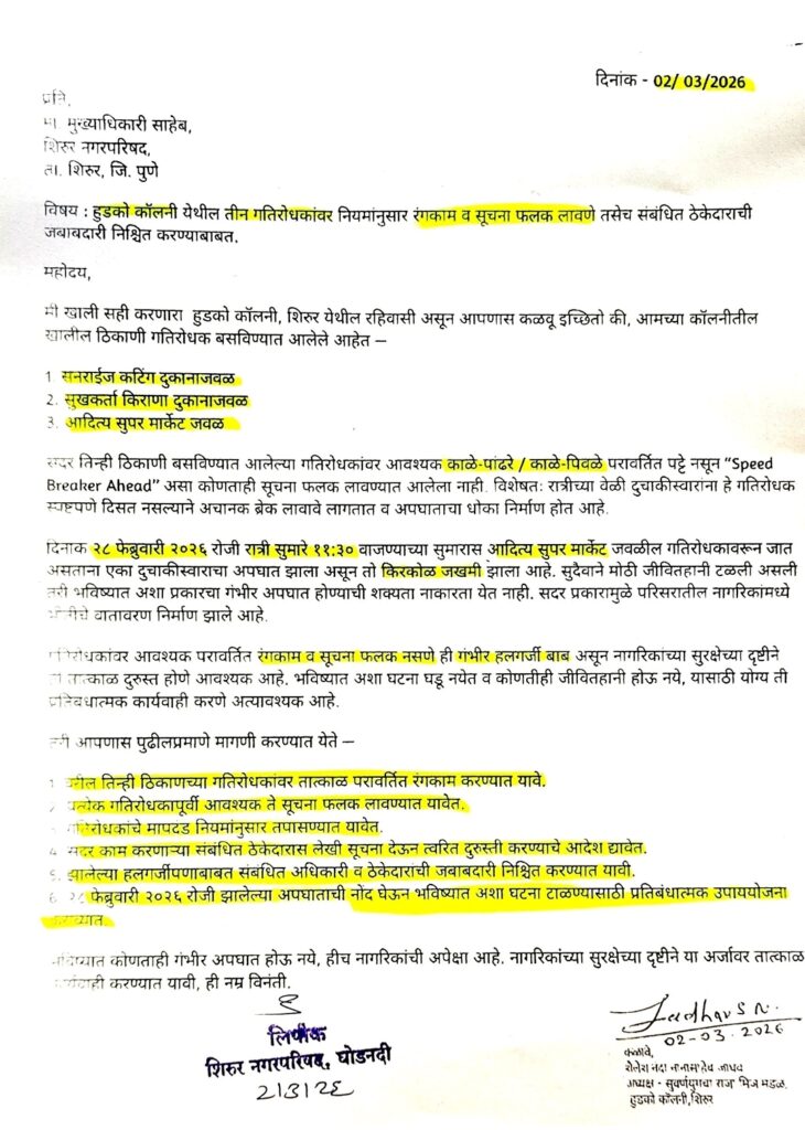 शिरुर (प्रतिनिधी) – शिरुर शहरातील हुडको काॅलनी येथील तीन गतिरोधकांवर नियमांनुसार परावर्तित रंगकाम व सूचना फलक नसल्यामुळे अपघाताचा धोका वाढला असून आज स्थानिक नागरिकांनी शिरुर नगरपरिषद प्रशासनाकडे लेखी निवेदन देऊन तात्काळ कारवाईची मागणी केली आहे.