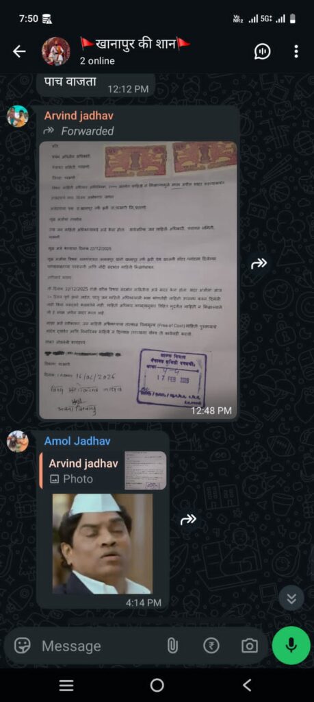 परभणी माहिती अधिकाराचा (RTI) अर्ज करणं हा प्रत्येक नागरिकाचा घटनात्मक अधिकार आहे, मात्र खानापूरमध्ये एका अर्जदाराचा माहिती अधिकाराचा अर्ज चक्क व्हॉट्सॲप ग्रुपवर व्हायरल केल्याचा धक्कादायक प्रकार समोर आला आहे. ‘खानापूर की शान’ नावाच्या एका व्हॉट्सॲप ग्रुपवर अरविंद जाधव यांनी हा अर्ज शेअर केल्यामुळे परिसरात खळबळ उडाली असून, सरकारी यंत्रणेच्या गोपनीयतेच्या नियमांवर प्रश्नचिन्ह निर्माण झाले आहे.नेमके प्रकरण काय?मिळालेल्या माहितीनुसार, संबंधित अर्जदाराने परभणी पंचायत समितीमध्ये माहिती अधिकारांतर्गत काही प्रश्न विचारले होते. संबंधित माहिती वेळेत न मिळाल्याने अर्जदाराने प्रथम अपिलीय अधिकाऱ्यांकडे अपील दाखल केले होते. हा अधिकृत सरकारी दस्तऐवज आणि अर्जदाराची वैयक्तिक माहिती अत्यंत संवेदनशील असताना, ती ‘खानापूर की शान’ या सार्वजनिक ग्रुपवर पोस्ट करण्यात आली. या कृतीमुळे अर्जदाराची ओळख सार्वजनिक झाली असून त्यांना मानसिक त्रास सहन करावा लागत आहे.गोपनीयतेचे उल्लंघन आणि नियमांचा पायमल्लीमाहिती अधिकार कायद्यानुसार, अर्जदाराची माहिती सुरक्षित ठेवणे ही संबंधित प्रशासकीय अधिकाऱ्यांची जबाबदारी असते. मात्र, हा दस्तऐवज सार्वजनिक मंचावर आल्याने खालील बाबींवर आक्षेप घेतला जात आहे:गोपनीयतेचा हक्क (Right to Privacy): अर्जदाराची ओळख आणि अर्जाचा तपशील सार्वजनिक करणे हे त्यांच्या गोपनीयतेच्या अधिकाराचे गंभीर उल्लंघन आहे. यामुळे अर्जदाराच्या सुरक्षेचाही प्रश्न निर्माण होऊ शकतो.सरकारी सेवा नियम (Conduct Rules): महाराष्ट्र नागरी सेवा (वर्तणूक) नियमावलीनुसार, कोणत्याही सरकारी कर्मचाऱ्याने किंवा संबंधित व्यक्तीने नागरिकांची बदनामी करणे, त्यांना धमकावणे किंवा त्यांची माहिती सार्वजनिक करणे हे नियमांचे उल्लंघन आहे. अशा प्रकारची कृत्ये ही प्रशासकीय शिस्तीच्या विरोधात आहेत