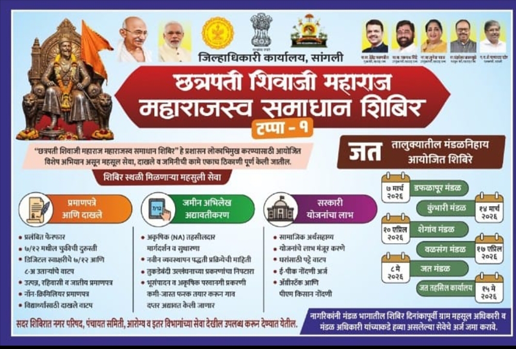 प्रशासनाला अधिक लोकाभिमुख करण्यासाठी आणि नागरिकांची महसूल विभागाशी संबंधित प्रलंबित कामे तातडीने मार्गी लावण्यासाठी सांगली जिल्हाधिकारी कार्यालयाच्या वतीने जत तालुक्यात ‘छत्रपती शिवाजी महाराज महाराजस्व समाधान शिबिर’ (टप्पा-१) चे आयोजन करण्यात आले आहे. या विशेष मोहिमेमुळे तालुक्यातील नागरिकांना दाखले आणि जमिनीच्या कामांसाठी आता सरकारी कार्यालयांचे उंबरठे झिजवावे लागणार नाहीत.