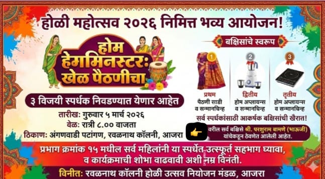 होळी पौर्णिमेच्या उत्साहात भर टाकण्यासाठी आजरा येथील रवळनाथ कॉलनी येथे विशेष कार्यक्रमाचे आयोजन करण्यात आले आहे. आज, गुरुवार दिनांक ५ मार्च २०२६ रोजी रात्री ठीक ८.०० वाजता अंगणवाडी पटांगणात महिलांसाठी अत्यंत लोकप्रिय असा “होम मिनिस्टर: खेळ पैठणीचा” हा कार्यक्रम पार पडणार आहे.