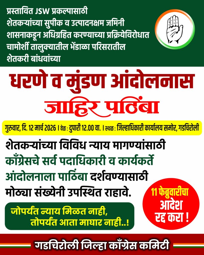 नितेश गट्टीवार ,चामोर्शी (गडचिरोली):दि.५मार्च तालुक्यातील भेंडाळा भागातील शेतकरी व शेतमजूर 11फेब्रुवारी 2026 रोजी जारी करण्यात आलेल्या शासन निर्णयाच्या जीआर निषेधार्थ सामुदायिक होळी दहन आंदोलन करण्यात आले होते . त्या पाठोपाठ १२ मार्च रोजी जिल्हाधिकारी कार्यालयासमोर धरणे व मुंडन आंदोलन करण्यात येणार आहे.आंदोलनाला कांग्रेस पक्षाने जाहीर पाठिंबा दिला आहे. शासनाने 11फेब्रुवारी रोजी काढलेल्या जमीन अधिग्रहण जि आर मुळे भेंडाळा भागातील शेतकऱ्यांच्या जमिनींचे अधिग्रहण येणाऱ्या काळात होण्याचा भितीने शेतकरी आर्थिकदृष्ट्या उध्वस्त होत असल्याचा आरोप शेतकरी व शेतमजूर यांच्या कडून केला जात आहे. शासनाने काढलेल्या जीआर मुळे अनेक शेतकऱ्यांच्या शेतीवर परिणाम होणार असून , योग्य मोबदला, पुनर्वसन व पर्यायी उपजिविकेसाठी हमी न देता जमिन संपादनाची प्रक्रीया राबवीली जात आहे.त्यामुळे शेतकरी व शेतमजूरांमध्ये तिव्र नाराजी पसरली आहे.सरकारने हा निर्णय मागे घ्यावा, यासाठी 12 मार्च रोजी जिल्हाधिकारी कार्यालयासमोर धरणे व मुंडन आंदोलन करण्यात येणार आहे, जिल्हा काँग्रेस कमिटीच्या वतीने भेंडाळा परीसरातील शेतकरी, शेतमजूर व कांग्रेस पदाधिकाऱ्यांनी ,कार्यकर्तांनी जास्तीत जास्त संख्येने उपस्थित राहण्याचे आवाहन केले आहे.