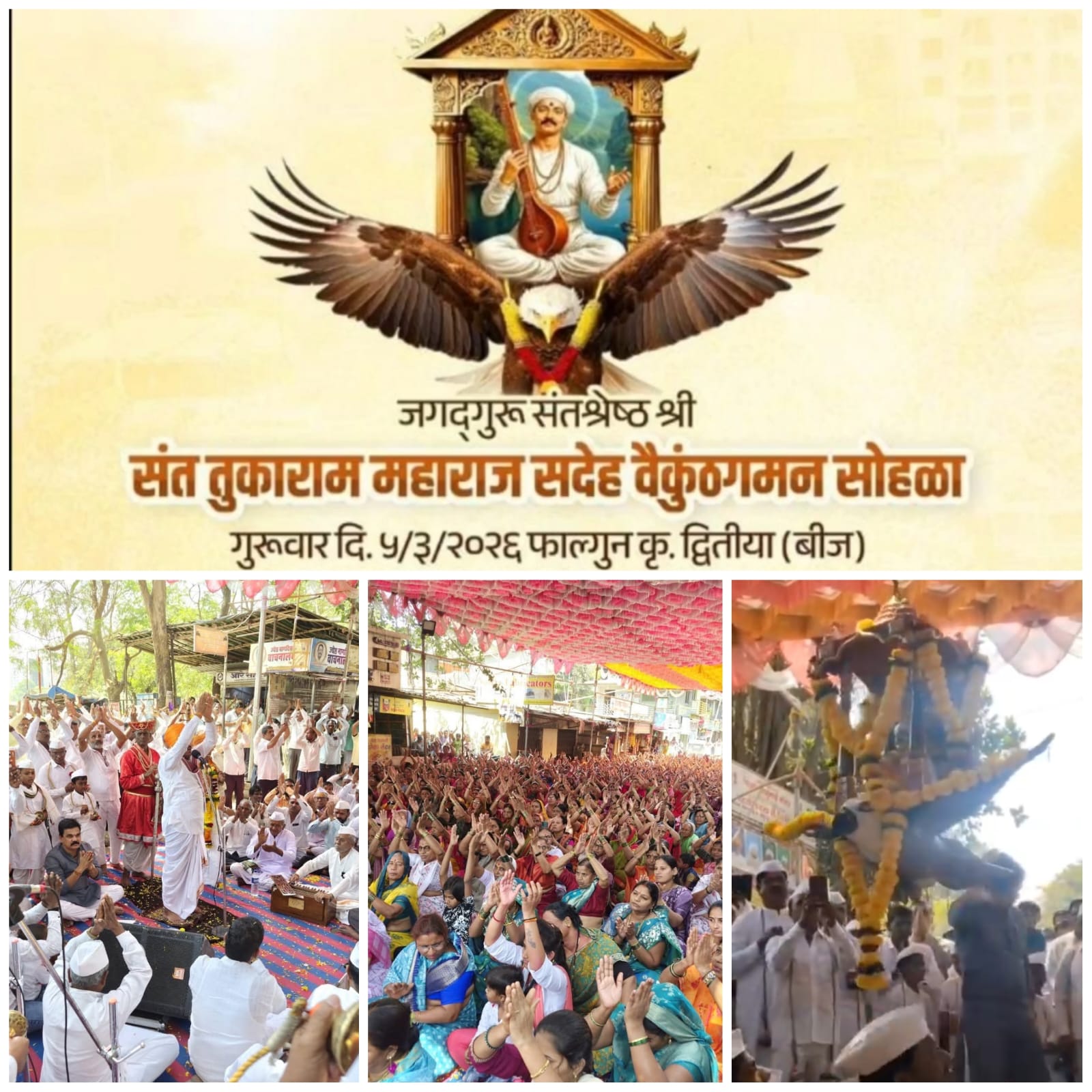 सकाळी संत तुकाराम महाराज सदेह वैकुंठ गमन सोहळा मोठ्या प्रमाणात परिसरातील वारकरी व नागरिकांच्या उपस्थितीत पार पडला या वेळी गरुडाची प्रतिकृती बनवून यात संत तुकाराम महाराज यांची प्रतिमा ठेवून नामस्मरणात हा सोहळा पार पडला.
