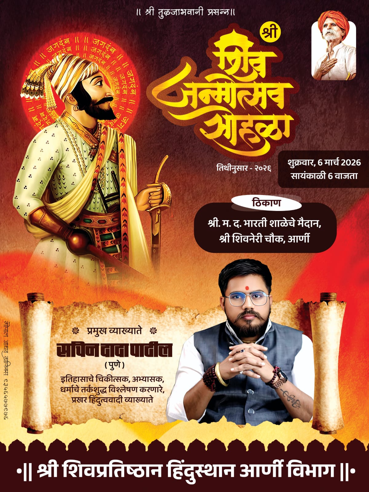 शुक्रवार, ६ मार्च रोजी सायंकाळी ६ वाजता श्री म. द. भारती विद्यालय मैदान, श्री शिवनेरी चौक, आर्णी येथे हा कार्यक्रम होणार आहे. या प्रसंगी प्रख्यात वक्ते सचिन तात्यापाटील (पुणे) यांचे विशेष व्याख्यान आयोजित करण्यात आले आहे.