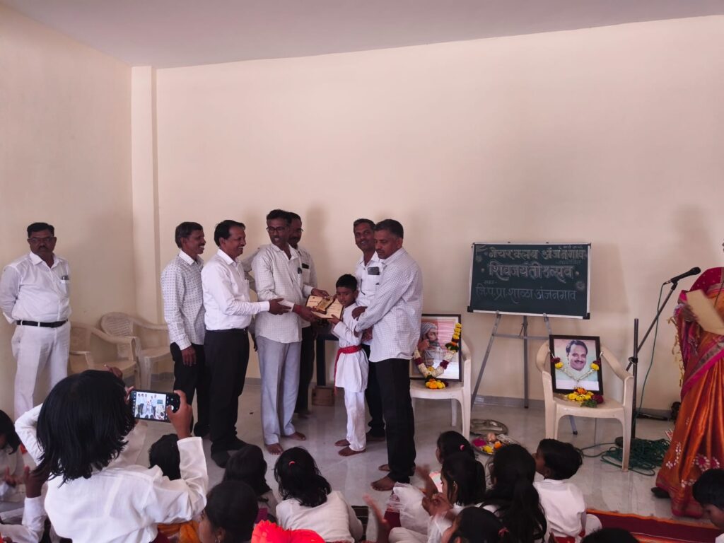 अंजनगाव जिल्हा परिषद शाळेत साजऱ्या करण्यात आलेल्या शिवजयंती सोहळ्यात लेझीम पथकातील विद्यार्थ्यांचा सन्मान करताना मान्यवर.