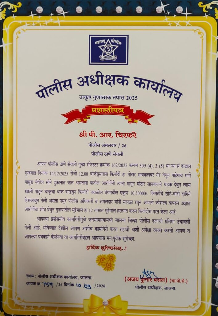 जालना :- कर्तव्यदक्ष व तत्पर तपासकामगिरी करत गुन्ह्याचा अवघ्या १२ तासांत उलगडा करणाऱ्या पोलीस अंमलदार प्रल्हाद चिरफरे ( केवट ) (पोलीस ठाणे सेवली) यांना पोलीस अधीक्षक कार्यालय, जालना यांच्या वतीने प्रशस्तीपत्र प्रदान करून सन्मानित करण्यात आले.
