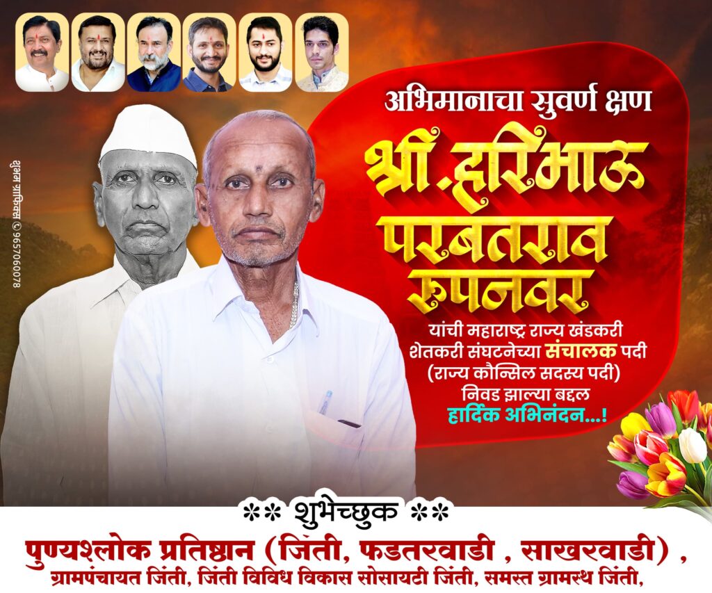 महाराष्ट्र राज्य खंडकटरी शेतकरी संघटनेच्या संचालक पदी (राज्य कौन्सिल सदस्य पदी) श्री. हरिभाऊ परबतराव रुपनवर यांची निवड करण्यात आली आहे. त्यांच्या या निवडीमुळे परिसरातील शेतकरी वर्गामध्ये आनंदाचे वातावरण निर्माण झाले आहे.