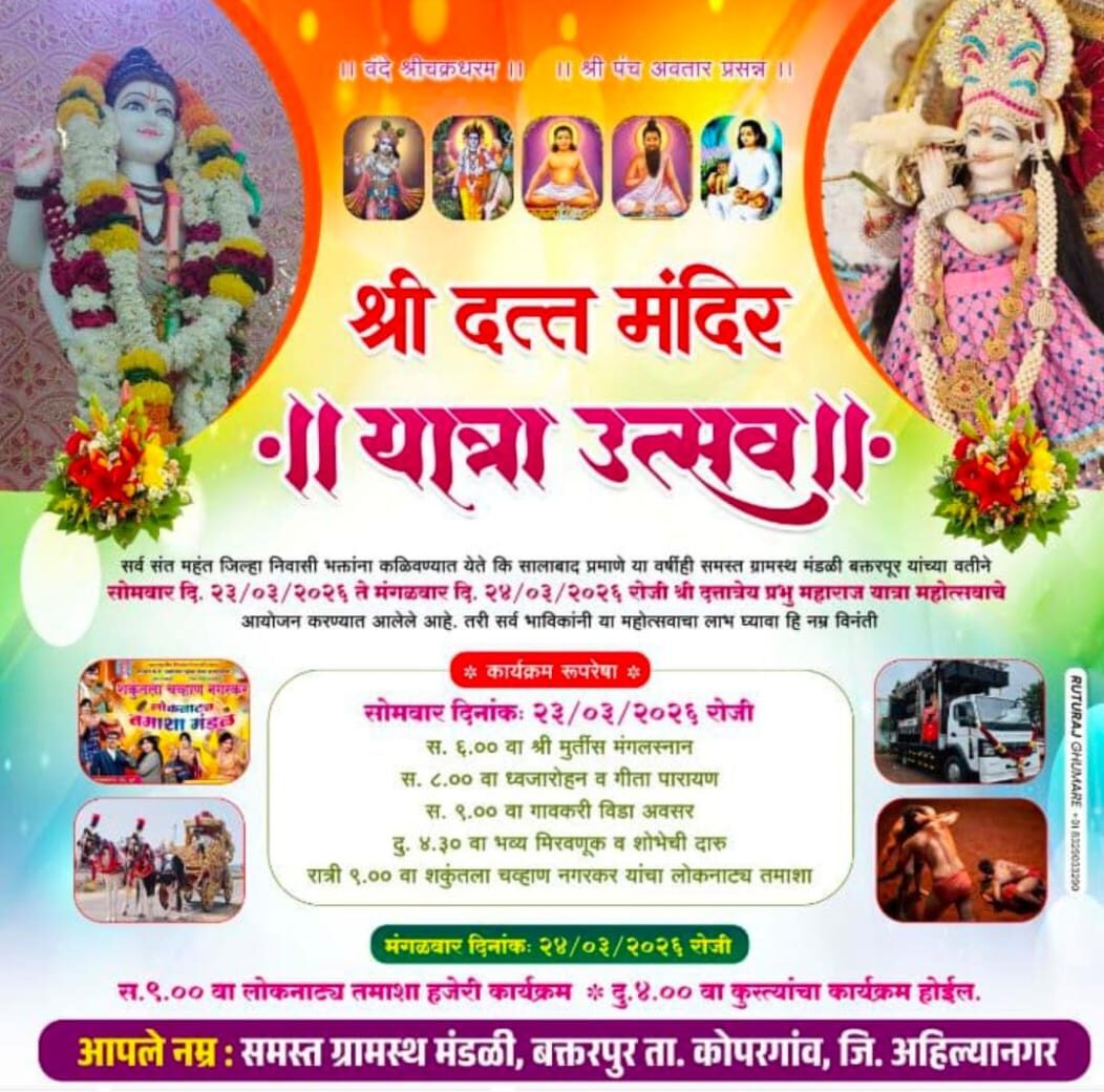 कोपरगाव (प्रतिनिधी): कोपरगाव तालुक्यातील बक्तरपूर गावातील श्री दत्त मंदिर येथे दि. २३ व २४ मार्च २०२६ रोजी भव्य दिव्य यात्रा उत्सव मोठ्या उत्साहात आणि भक्तिमय वातावरणात साजरा करण्यात आला. यात्रेनिमित्त संपूर्ण गावात आनंदाचे आणि उत्साहाचे वातावरण निर्माण झाले होते.