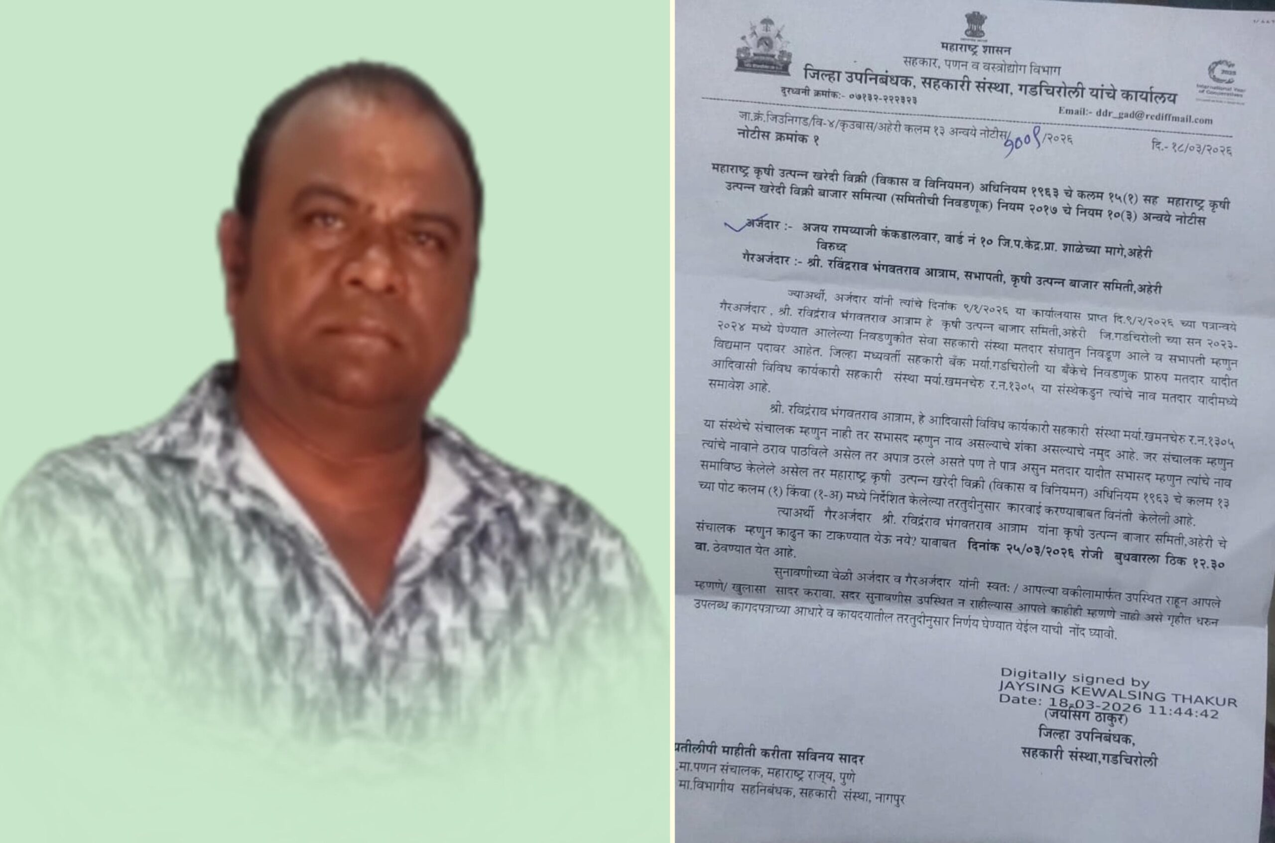 नोटीसमध्ये गैरअर्जदार म्हणून श्री.रविंद्र बाबा आत्राम सभापती कृषी उत्पन्न बाजार समिती अहेरी) यांचे नाव नमूद करण्यात आले आहे.तसेच प्रकरणात आदिवासी विविध कार्यकारी सहकारी संस्था मर्यादित (नोंदणी क्र. ३७३०) या संस्थेचाही संदर्भ देण्यात आला आहे.