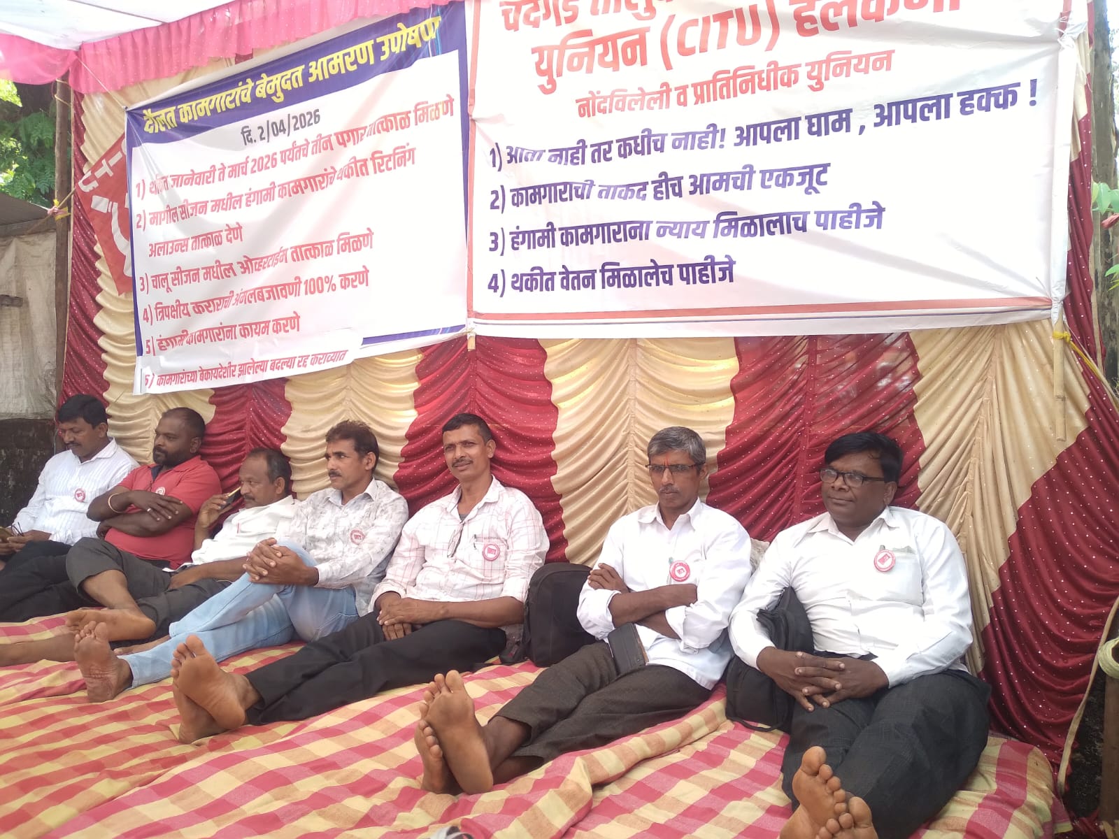 दौलत साखर कारखान्यातील कामगारांच्या प्रलंबित मागण्यांचा प्रश्न आता ऐरणीवर आला असून, वारंवार आश्वासने मिळूनही थकीत वेतन न मिळाल्याने संतप्त कामगारांनी आज, २ एप्रिल २०२६ पासून चंदगड तहसीलदार कार्यालयासमोर बेमुदत आमरण उपोषण सुरू केले आहे. ‘चंदगड तालुका साखर कामगार युनियन (CITU)’ च्या नेतृत्वाखाली सुरू असलेल्या या आंदोलनात शेकडो कामगार सहभागी झाले असून, “आता नाही तर कधीच नाही” अशी ठाम भूमिका त्यांनी घेतली आहे.