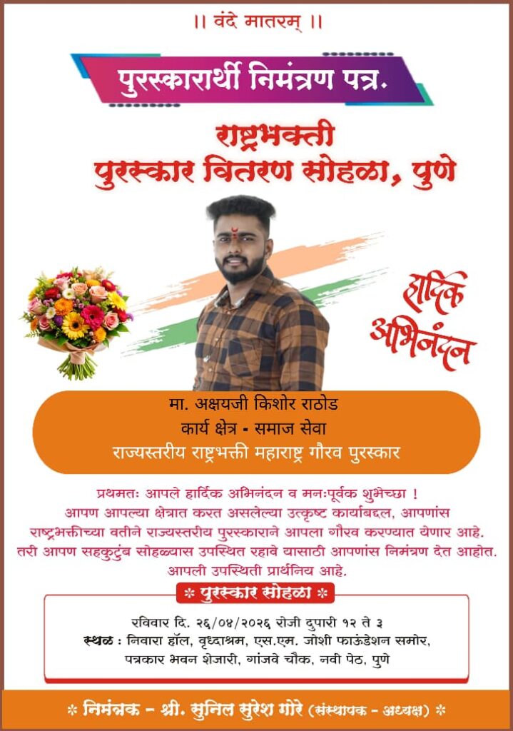 गरजू व आर्थिकदृष्ट्या दुर्बल रुग्णांसाठी सातत्याने कार्य करणारे समाजसेवक अक्षय राठोड यांना राज्यस्तरीय ‘राष्ट्रभक्ती महाराष्ट्र गौरव पुरस्कार’ प्रदान करून सन्मानित करण्यात आले. त्यांच्या रुग्णसेवा व सामाजिक कार्यातील उल्लेखनीय योगदानाची दखल घेत हा पुरस्कार देण्यात आला.