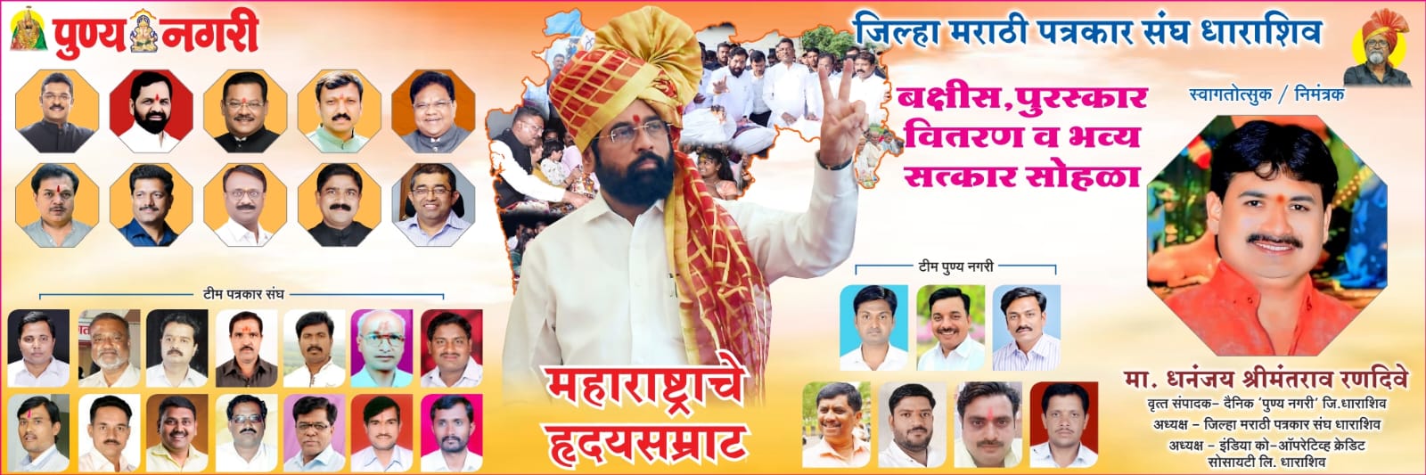 आ. राणाजगजितसिंह पाटील, आ. कैलास घाडगे पाटील, आ. प्रविण स्वामी, माजी आ. ज्ञानराज चौगुले यांची उपस्थिती राहणार आहे. या सोहळ्यात उपमुख्यमंत्री श्री. शिंदे यांच्या हस्ते दैनिक ‘पुण्य नगरी’च्या कूपन स्पर्धेतील विजेत्यांना बक्षीस वितरण करण्यात येणार आहे. या सोहळ्यात सहकार क्षेत्रातील उल्लेखनिय कार्याबद्दल धाराशिव जनता सहकारी बँकेचे चेअरमन हभप वसंतराव नागदे, रुपामाता उद्योग समूहाचे चेअरमन ॲड. व्यंकटराव गुंड, वैद्यकीय व सामाजिक क्षेत्रातील कार्याबद्दल सह्याद्री हॉस्पीटल, अंकुर शिशुगृहाचे सर्वेसर्वा डॉ. दिग्गज दापके-देशमुख, बचत गट कार्यातून महिला सक्षमीकरणच्या उत्कृष्ट कार्याबद्दल राष्ट्रपती पुरस्कार विजेत्या अर्चना माने, कसबे तडवळे (ता.धाराशिव) येथील आदर्श शिक्षक बाळासाहेब जमाले, व्यसनमुक्ती क्षेत्रातील उत्कृष्ट कार्याबद्दल येरमाळा येथील श्री येडाई व्यसनमुक्ती केंद्राचे संस्थापक डॉ. संदीप तांबारे, तुळजापूर तालुक्यातील वडगाव (काटी) येथील प्रगतशील शेतकरी हणमंत गवळी, पार्डी (ता.वाशी) येथील पोल्ट्री उद्योजक विठ्ठल चौधरी,