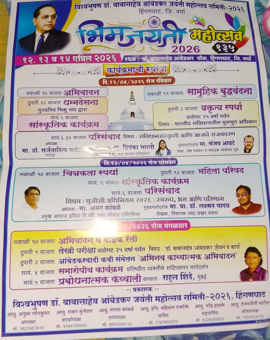 हिंगणघाट (प्रतिनिधी – प्रकाश झोडे) : Dr. B. R. Ambedkar यांच्या १३५ व्या जयंतीनिमित्त हिंगणघाट येथे १२ ते १४ एप्रिल २०२६ दरम्यान भव्य जयंती महोत्सवाचे आयोजन करण्यात आले आहे. Dr. Babasaheb Ambedkar Jayanti Mahotsav Samiti Hinganghat यांच्या वतीने हा महोत्सव डॉ. बाबासाहेब आंबेडकर चौक येथे पार पडणार असून विविध सामाजिक, शैक्षणिक, बौद्धिक आणि सांस्कृतिक कार्यक्रमांचे आयोजन करण्यात आले आहे