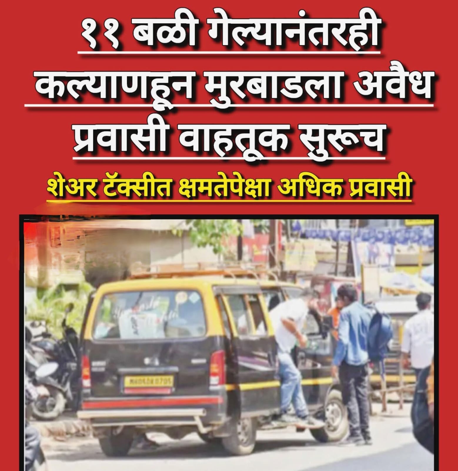 कल्याण–मुरबाड महामार्गावर रायता पुलाजवळ झालेल्या भीषण अपघातात ११ जणांचा मृत्यू झाल्यानंतरही या परिसरात अवैध प्रवासी वाहतूक सुरूच असल्याचे चित्र समोर आले आहे. मंगळवारीही शेअर टॅक्सी आणि इको व्हॅनमध्ये क्षमतेपेक्षा अधिक प्रवासी कोंबून प्रवास सुरू असल्याचे दिसून आले.