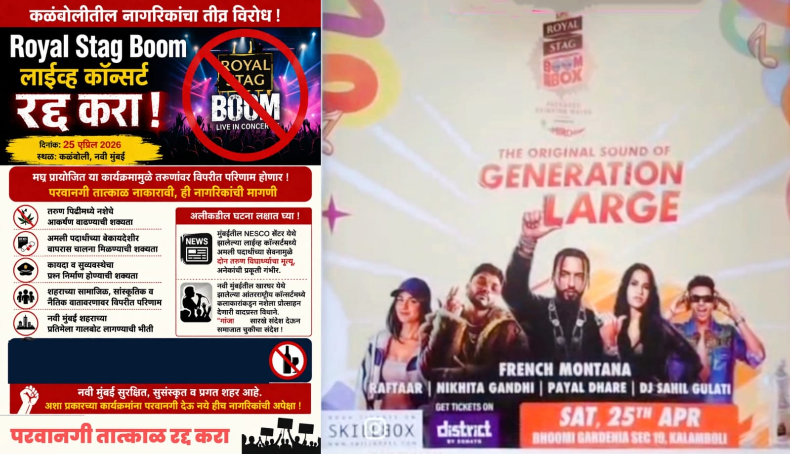 अलीकडेच मुंबईतील NESCO सेंटर येथे झालेल्या लाईव्ह कॉन्सर्टमध्ये अतिरिक्त ड्रग्स सेवनामुळे काही तरुणांचा मृत्यू झाल्याची अत्यंत दुर्दैवी घटना ताजी असताना, कळंबोली येथे दिनांक २५ एप्रिल 2026 रोजी भूमी गार्डनिया, रोडपाली स्पोर्ट्स ग्राउंड, सेक्टर-17 या ठिकाणी *“Royal Stag Boom Box” तर्फे भव्य लाईव्ह कॉन्सर्ट आयोजित करण्यात येत आहे.