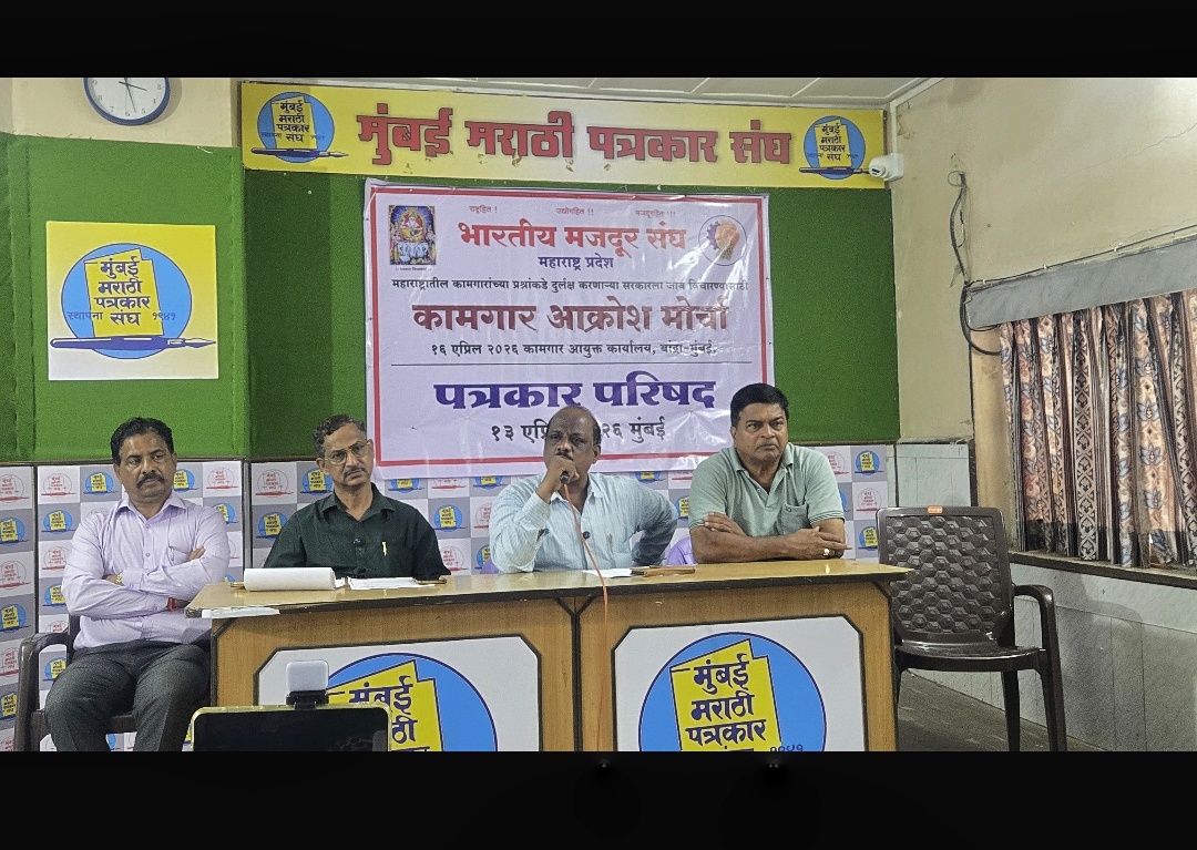 कामगारांच्या विविध मागण्यांच्या पूर्ततेसाठी व कामगारांच्या समस्या कडे शासनाचे लक्ष वेधून घेण्यासाठी भारतीय मजदूर संघातर्फे १६ एप्रिल २०२६ रोजी कामगार आयुक्त कार्यालय बांद्रा मुंबई येथे आक्रोश मोर्चा काढण्यात येणार आहे.त्या अनुषंगाने माहिती देण्यासाठी मुंबई मध्ये भारतीय मजदूर संघातर्फे पत्रकार परिषदेचे आयोजन करण्यात आले होते.