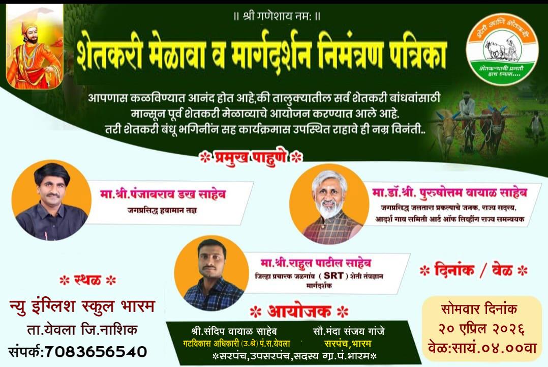 . भारम/ अंदरसुल प्रतिनिधी (भगवान रोठे/ श्री सुनिल गायकवाड) येवला तालुक्यातील आदर्श ग्रामपंचायत भारम व येवला पंचायत समिती तर्फे भारम पंचकृषीतील शेतकरी हितासाठी भव्य शेतकरी मेळावा सोमवार दिनांक २०/०४/२०२६ रोजी न्यू इंग्लिश स्कूल भारम. या ठिकाणी सायंकाळी ठीक ४ .०० वा. आयोजित केला असून यावेळी प्रमुख पाहुणे म्हणून मा. श्री. पंजाबराव डख साहेब (जगप्रसिद्ध हवामान तज्ञ) व मा.डॉ. श्री. पुरुषोत्तम वायाळ साहेब (जगप्रसिद्ध जलतारा प्रकल्पाचे जनक, राज्य सदस्य आदर्श गाव समिती, आर्ट ऑफ लिव्हीग राज्य समन्वयक)तसेच मा. श्री. राहुल पाटील साहेब (जिल्हा प्रचारक जळगाव एस.आर.टी. शेती तंत्रज्ञान मार्गदर्शक) हे शेतकऱ्यांना मार्गदर्शन करणार आहेत. हा मेळावा येवला तालुका पंचायत समितीचे माननीय गटविकास अधिकारी संदीपजी वायाळ सर व सौ मंदाताई संजय गांजे सरपंच भारम यांच्या संयुक्त विद्यमाने आयोजित केले असून,