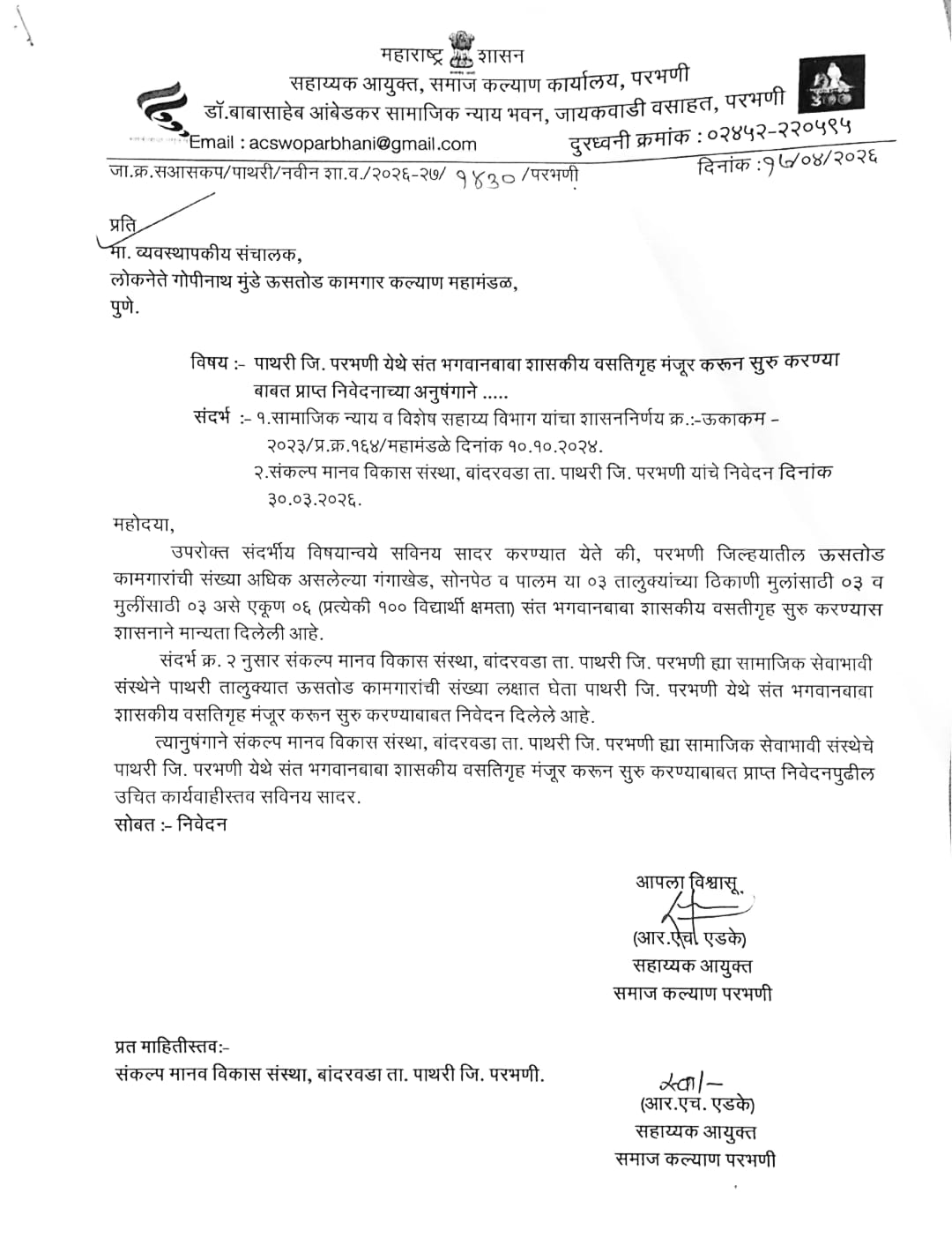 पाथरी तालुक्यातील ऊसतोड कामगारांच्या मुलांच्या शिक्षणाचा दीर्घकालीन प्रश्न मार्गी लावण्यासाठी ‘संत भगवानबाबा शासकीय वसतिगृह’ सुरू करण्याच्या मागणीला अखेर प्रशासकीय स्तरावर सकारात्मक गती मिळाली आहे. संकल्प मानव विकास संस्थेच्या सातत्यपूर्ण पाठपुराव्याची दखल घेत परभणी समाज कल्याण विभागाने संबंधित प्रस्ताव पुढील मंजुरीसाठी पुणे येथील लोकनेते गोपीनाथ मुंडे ऊसतोड कामगार कल्याण महामंडळाकडे पाठवला आहे.