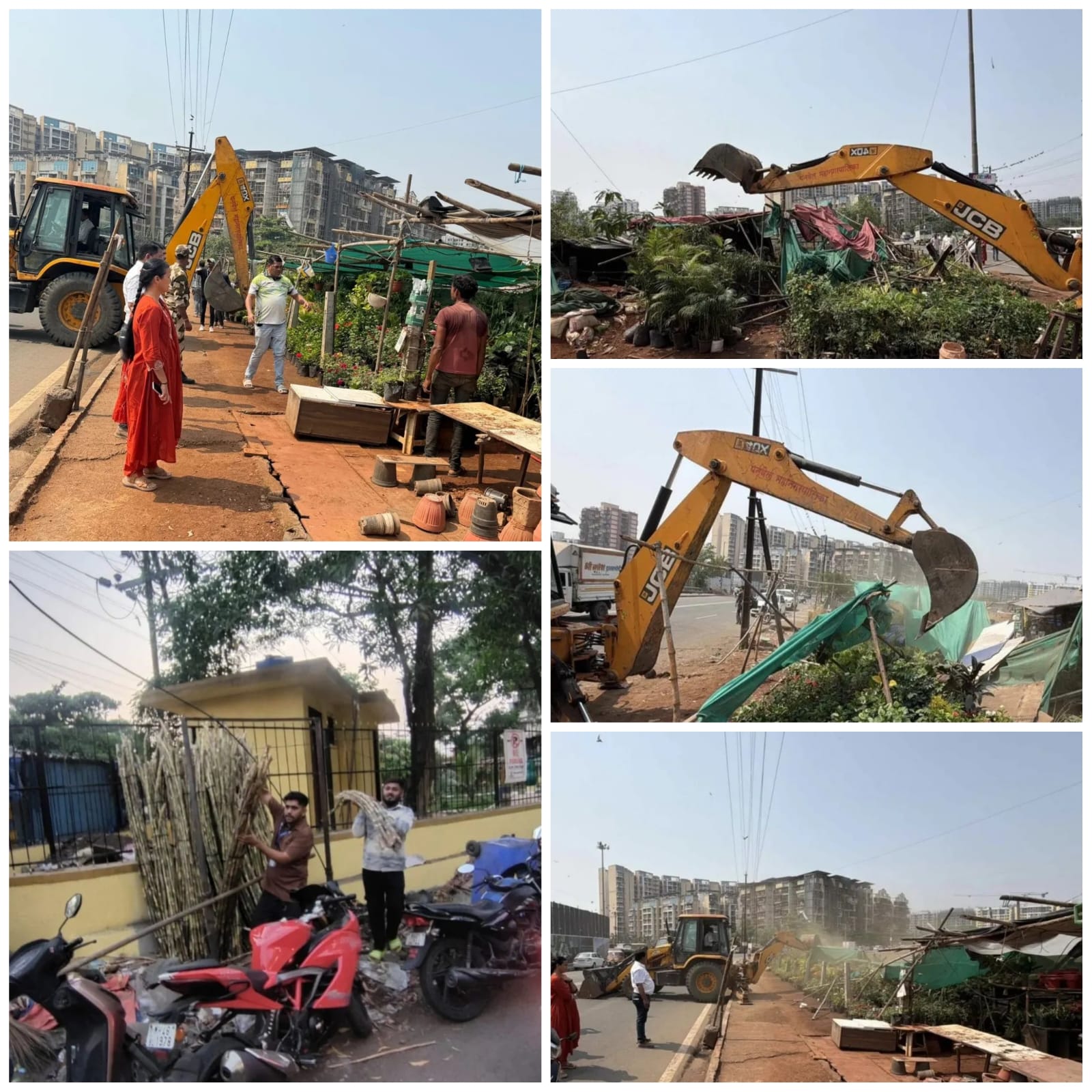 कामोठे पोलीस स्टेशनसमोरही फेरीवाल्यांवर कारवाई करत त्यांचे साहित्य जप्त करण्यात आले. याशिवाय सहाय्यक आयुक्त तथा प्रभाग अधिकारी डॉ. रूपाली माने आणि प्रभाग अधीक्षक दशरथ भंडारी यांच्या मार्गदर्शनाखाली बुधवारी सेक्टर १९, २५, अक्षर बिल्डिंग परिसर, खान्देश्वर स्टेशन, सेक्टर २१ आणि सेक्टर ३४ येथे अनधिकृत व विनापरवाना नर्सरींवर कारवाई करण्यात आली. संबंधित झोपड्या तोडण्यात आल्या.